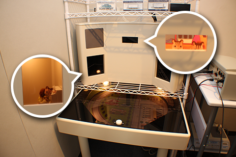 音が出ている間だけボタンを押すと楽しいおもちゃや可愛い人形が見えます。聞こえたときに自分で応答する検査を繰り返し練習することで正しく行えるようになっていきます。