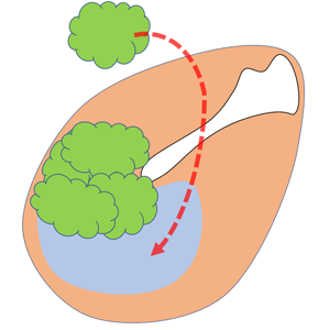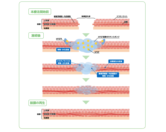 穿孔部に鼓膜再生の土台となるゼラチンスポンジを挿入し、内部の細胞増殖因子により鼓膜再生を促します。