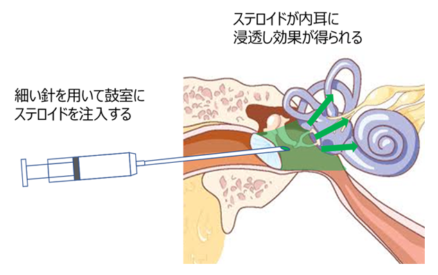 近年の研究で、ステロイド鼓室内投与療法は、点滴や内服などの全身投与療法と同程度の治療効果があることが示されています。また、米国の突発性難聴の診療ガイドラインでは、初期のステロイド全身投与療法で効果が見られない症例に対しては、追加治療として鼓室内投与を実施することが強く勧められています。